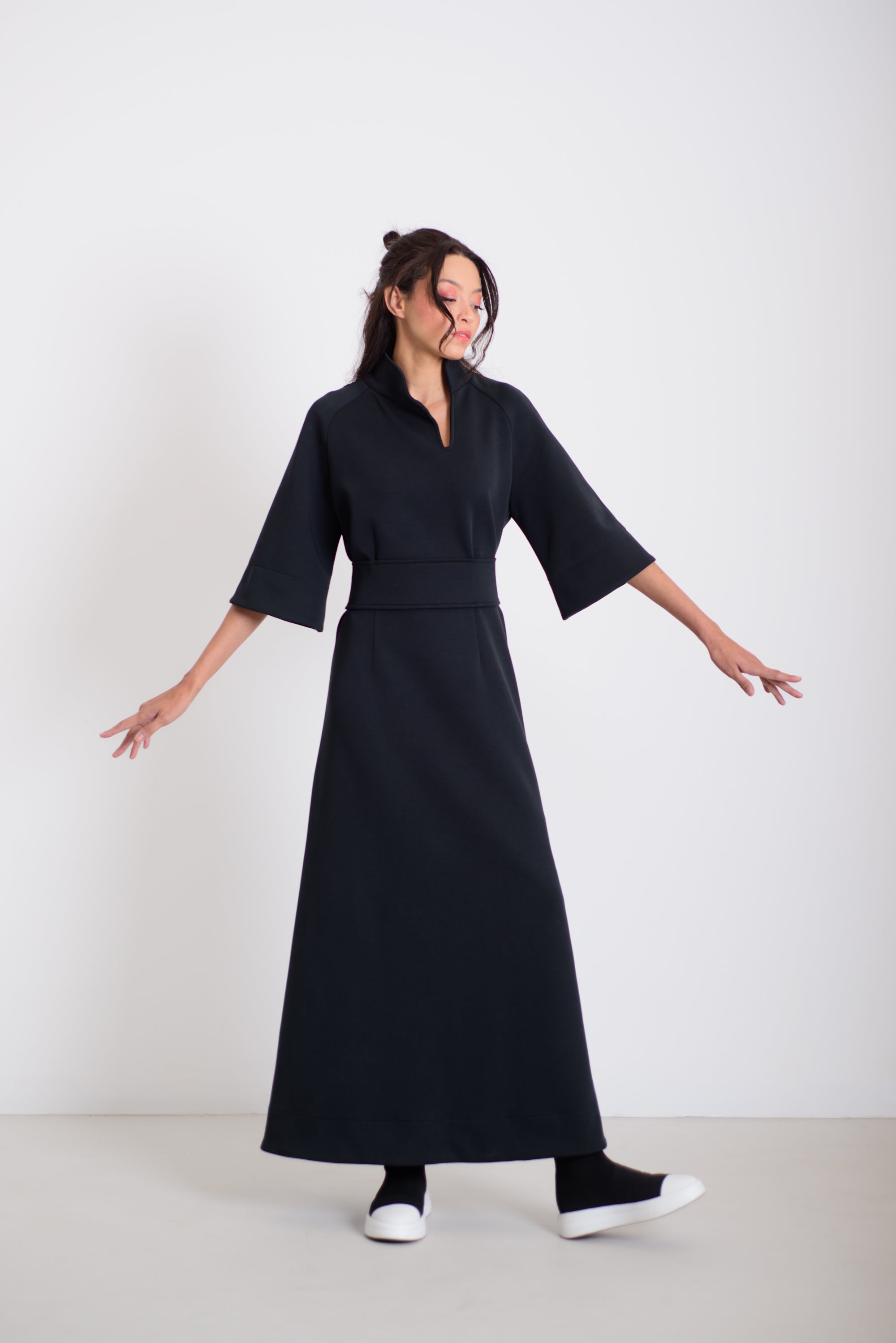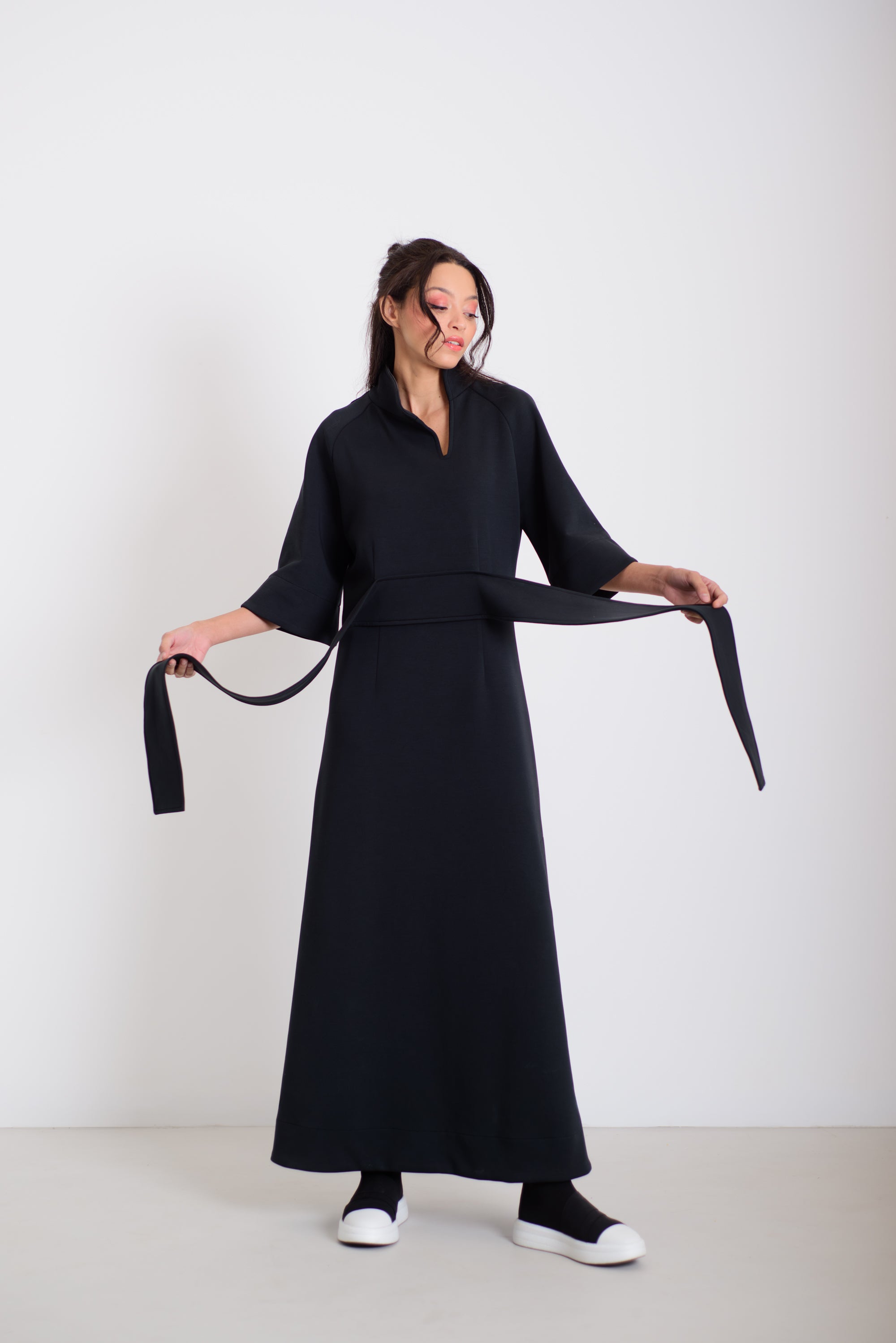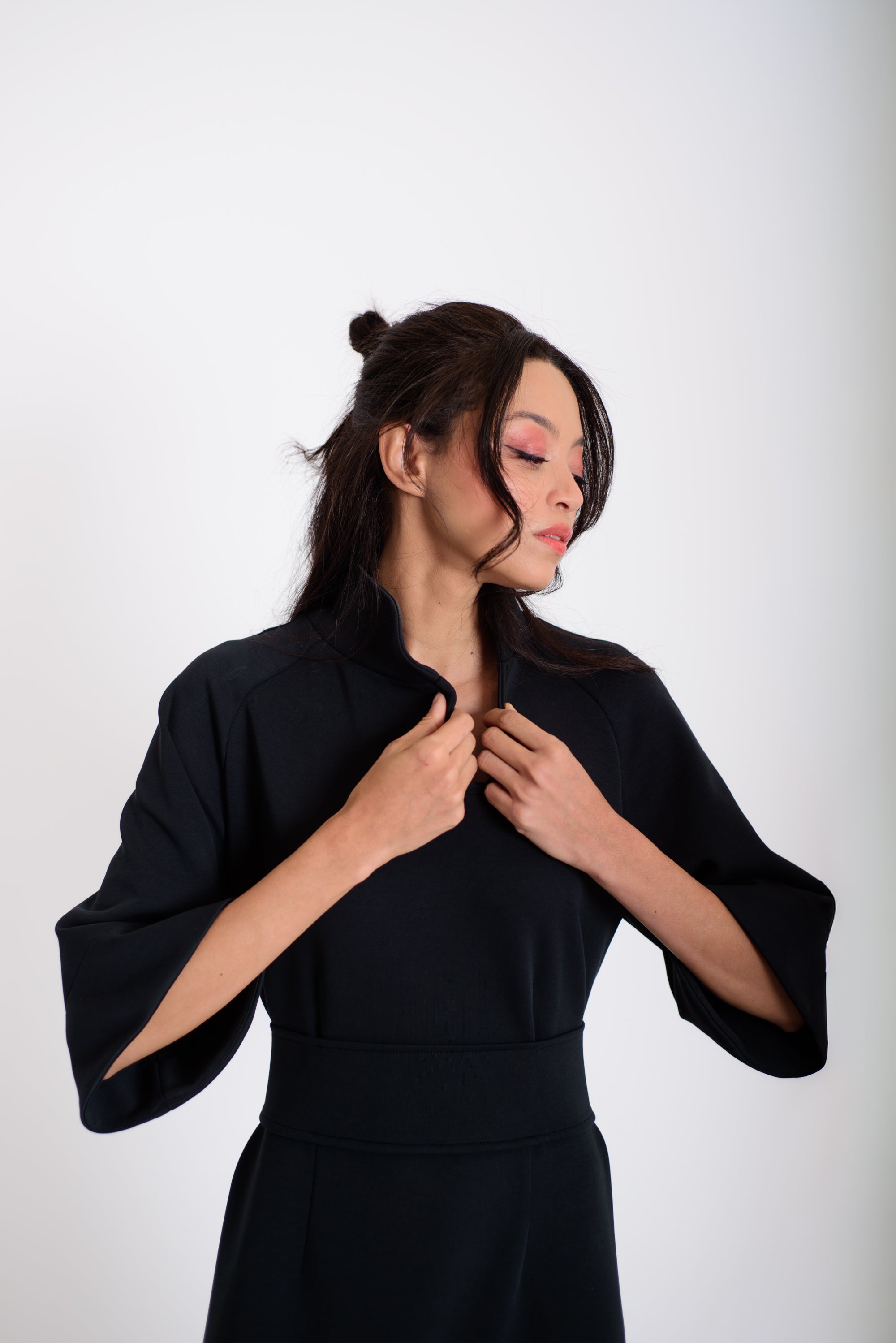 Japán stílusú ruhánk letisztult, mégis karakteres darab, amely egyedi dizájnjával és izgalmas tölcsérujjával azonnal kitűnik. Többféleképpen megköthető fazonja rugalmasan alkalmazkodik a viselőjéhez, így sportcipővel és magassarkúval is tökéletesen működik. A nem gyűrődő anyag kényelmessé és gondtalanná teszi a mindennapi viselést, miközben megőrzi elegáns formáját.