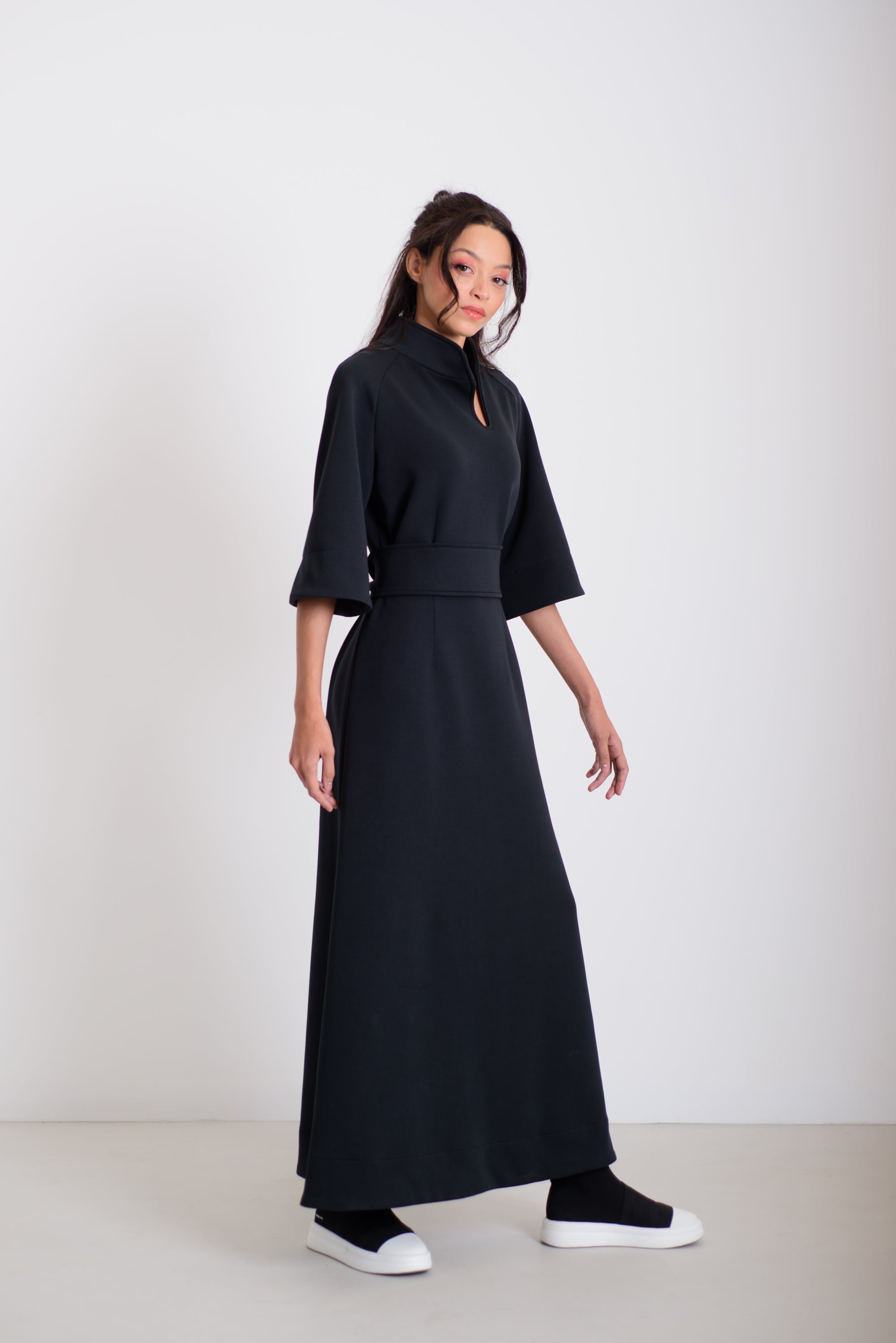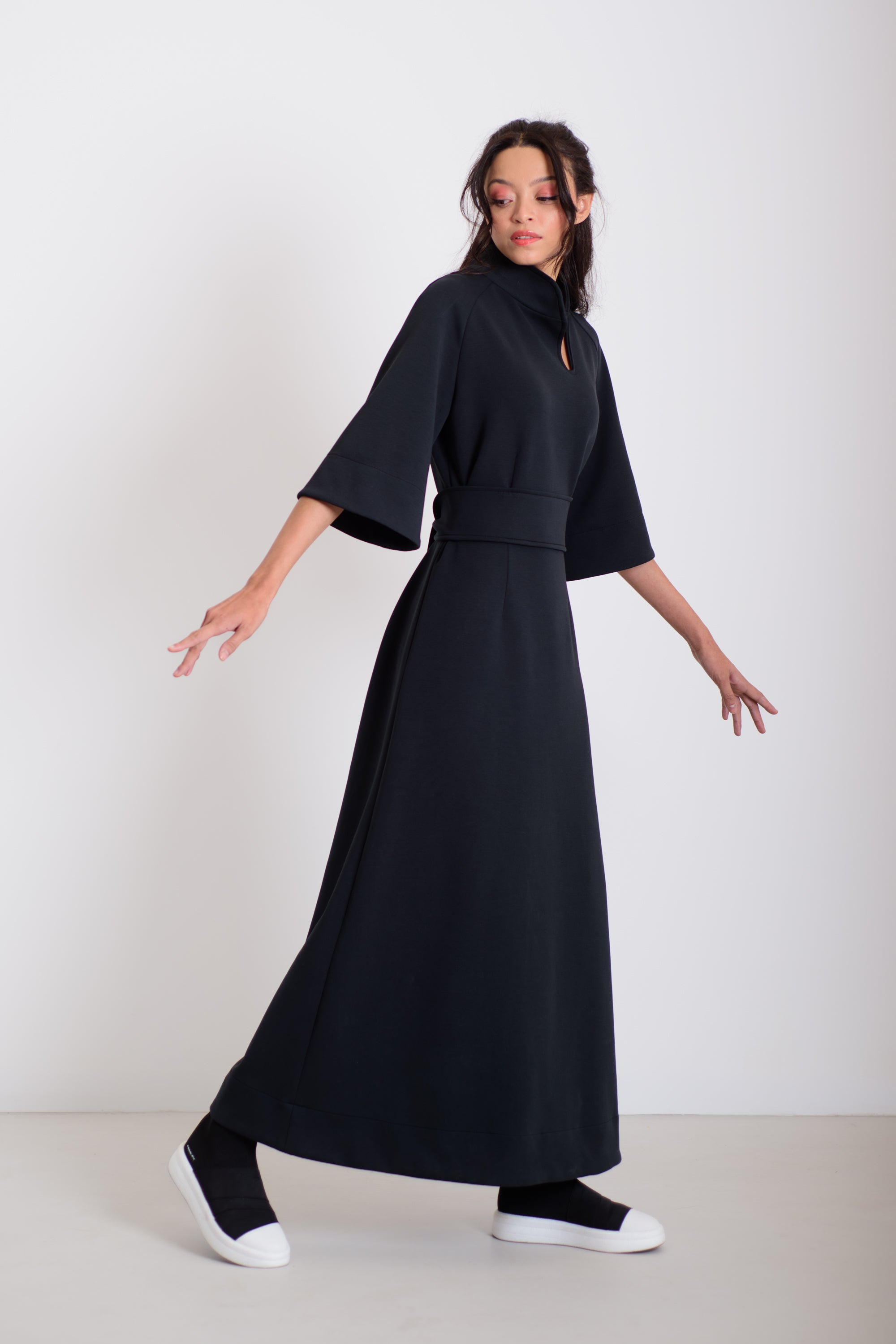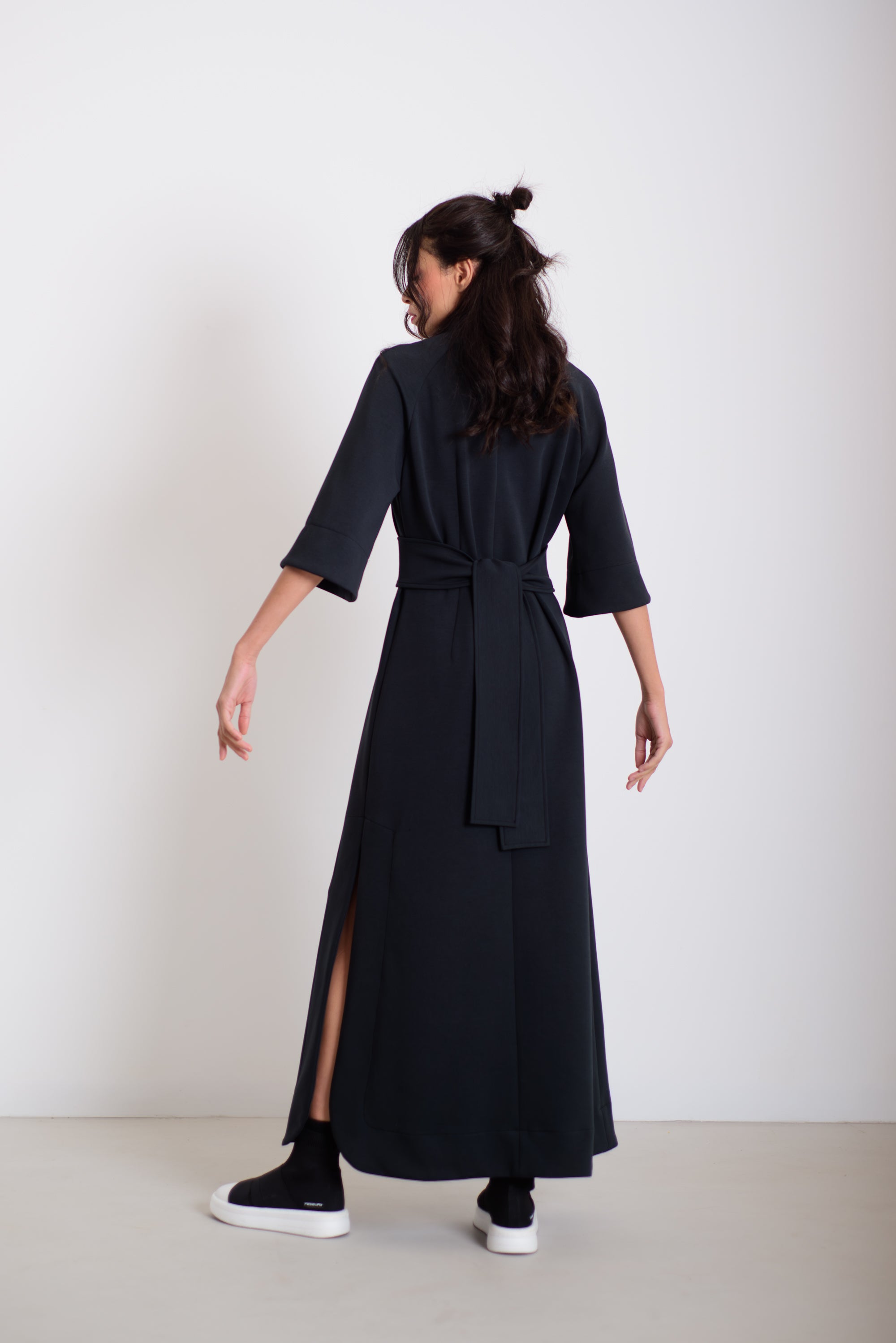 Japán stílusú ruhánk letisztult, mégis karakteres darab, amely egyedi dizájnjával és izgalmas tölcsérujjával azonnal kitűnik. Többféleképpen megköthető fazonja rugalmasan alkalmazkodik a viselőjéhez, így sportcipővel és magassarkúval is tökéletesen működik. A nem gyűrődő anyag kényelmessé és gondtalanná teszi a mindennapi viselést, miközben megőrzi elegáns formáját.