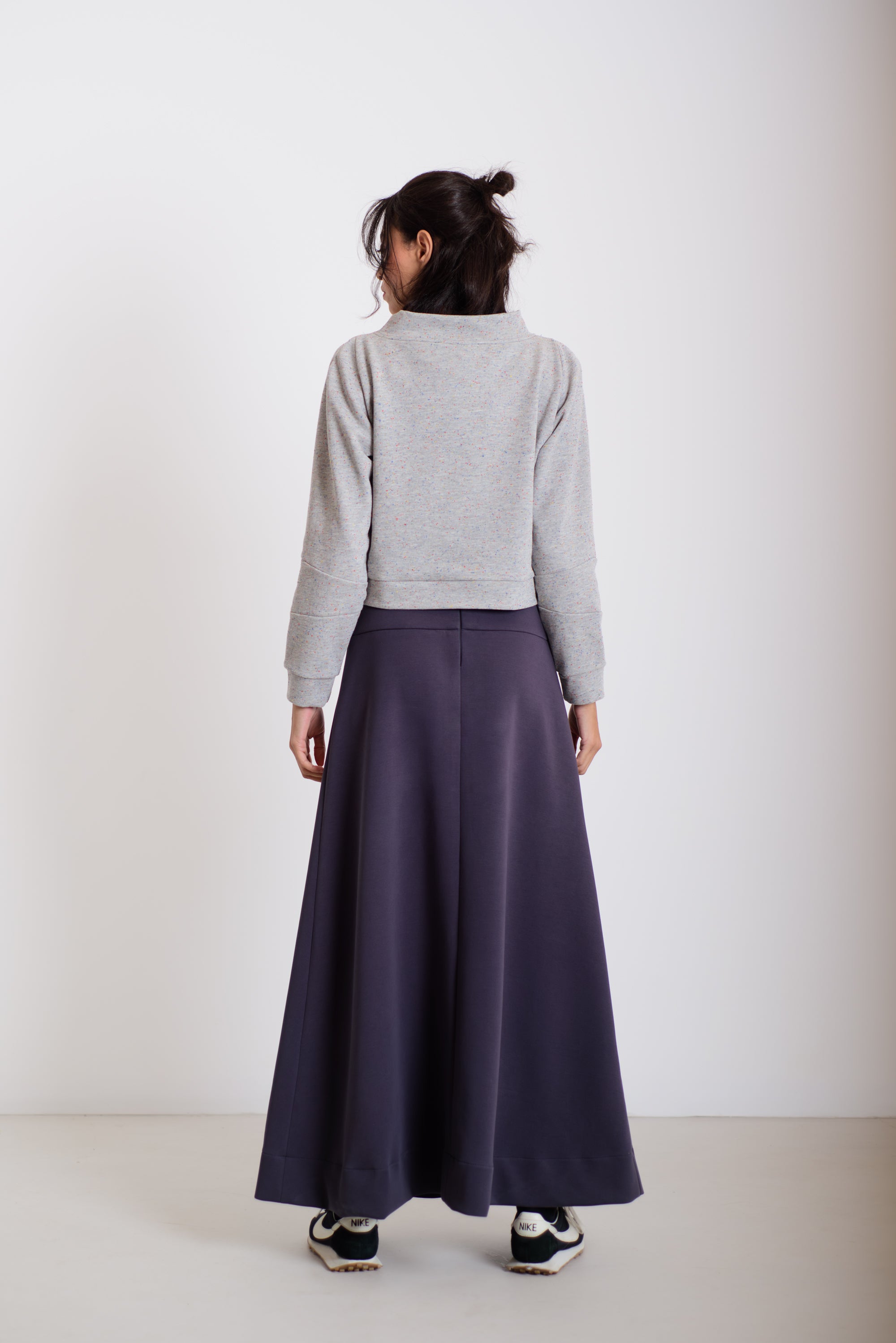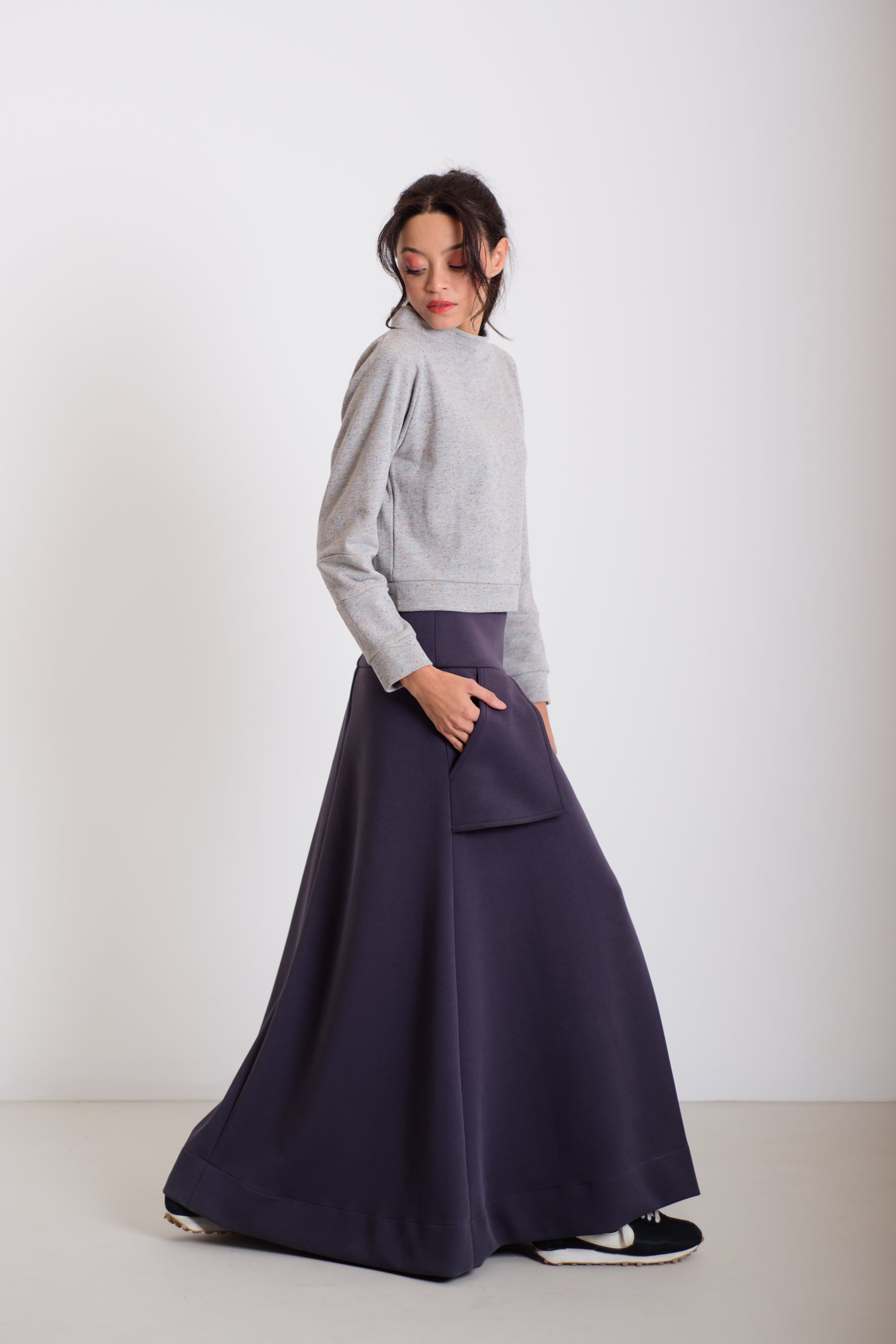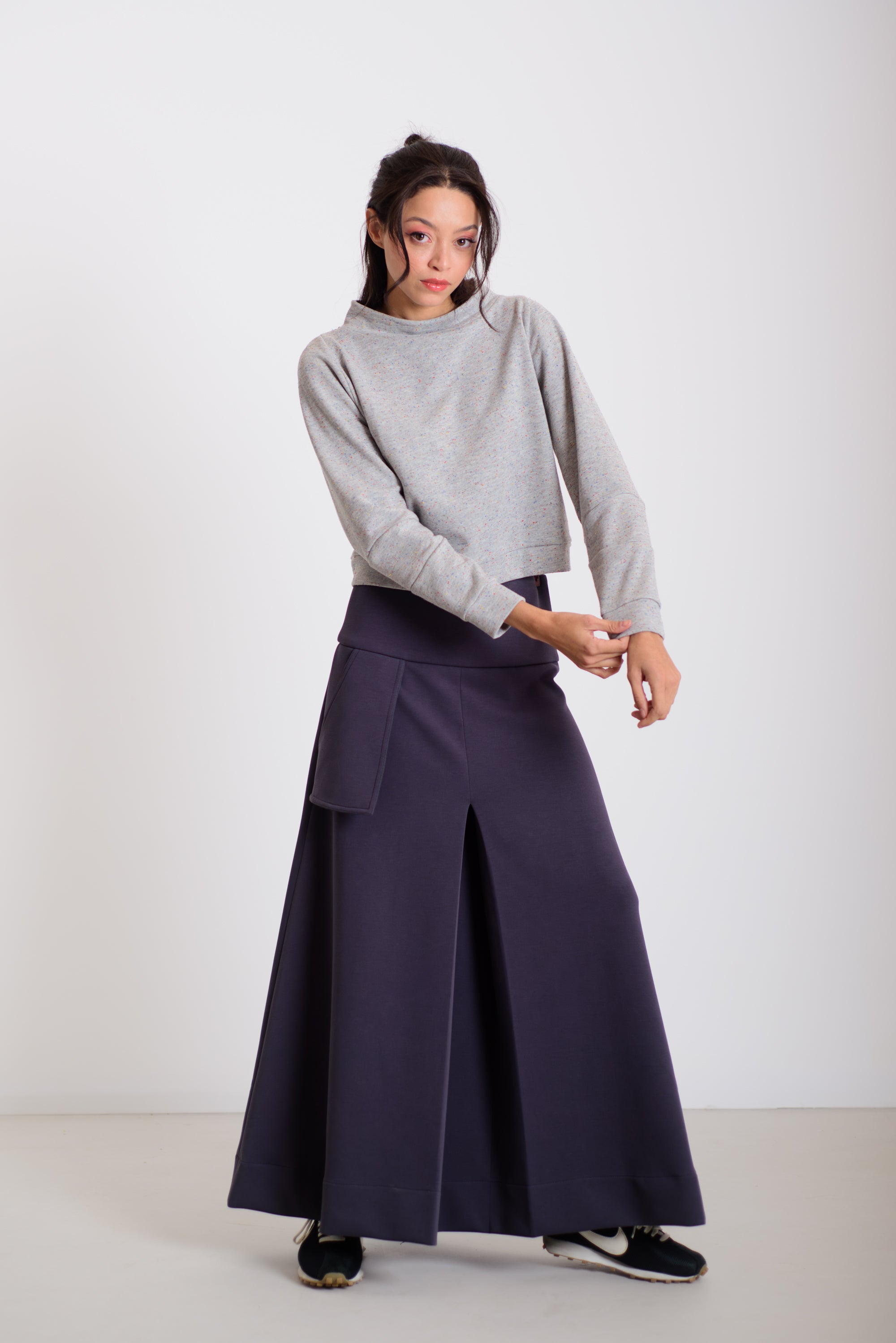 Ez az enyhén rövidített, cropped állású pulóver különleges, paneles megoldású ujjával igazán modern és letisztult megjelenést ad. Hossza tökéletesen illeszkedik a hajtott szoknyánk magasabb derekához, így arányos, nőies sziluettet formál. Anyaga belül simogatóan puha, kívül pedig gyönyörű, lágy esésű felületet ad – egy kényelmes, mégis extra darab, ami minden szettet finoman megemel.