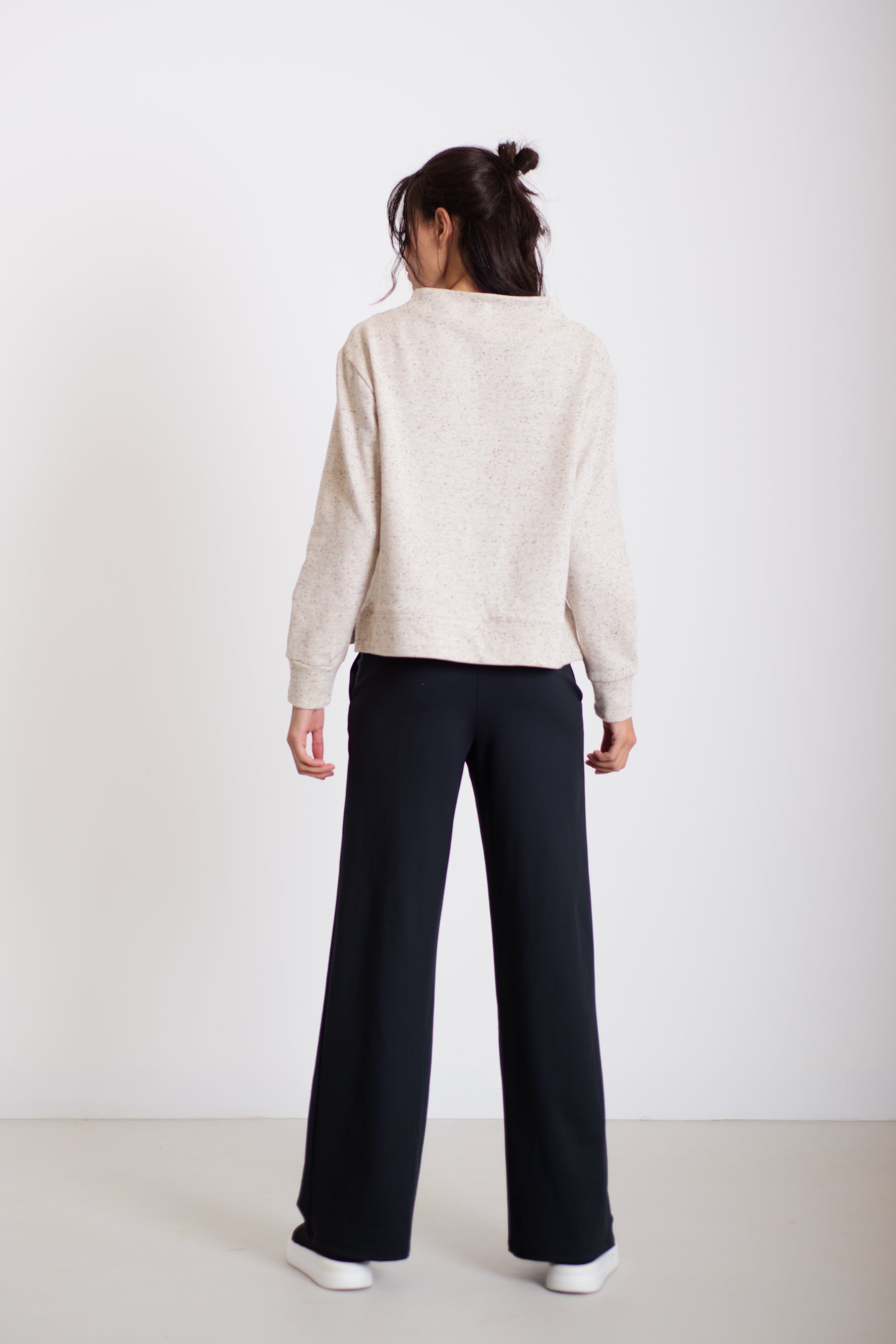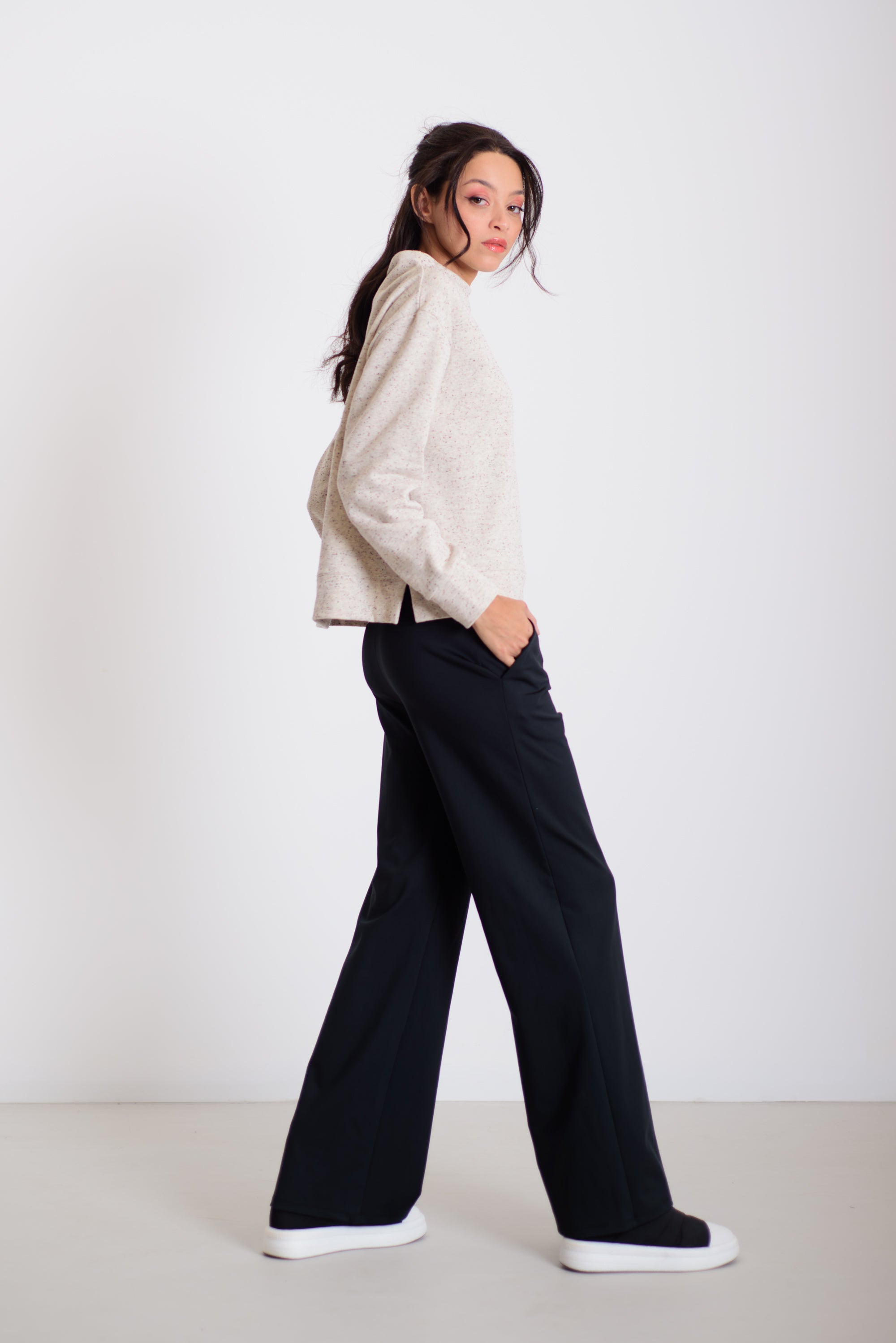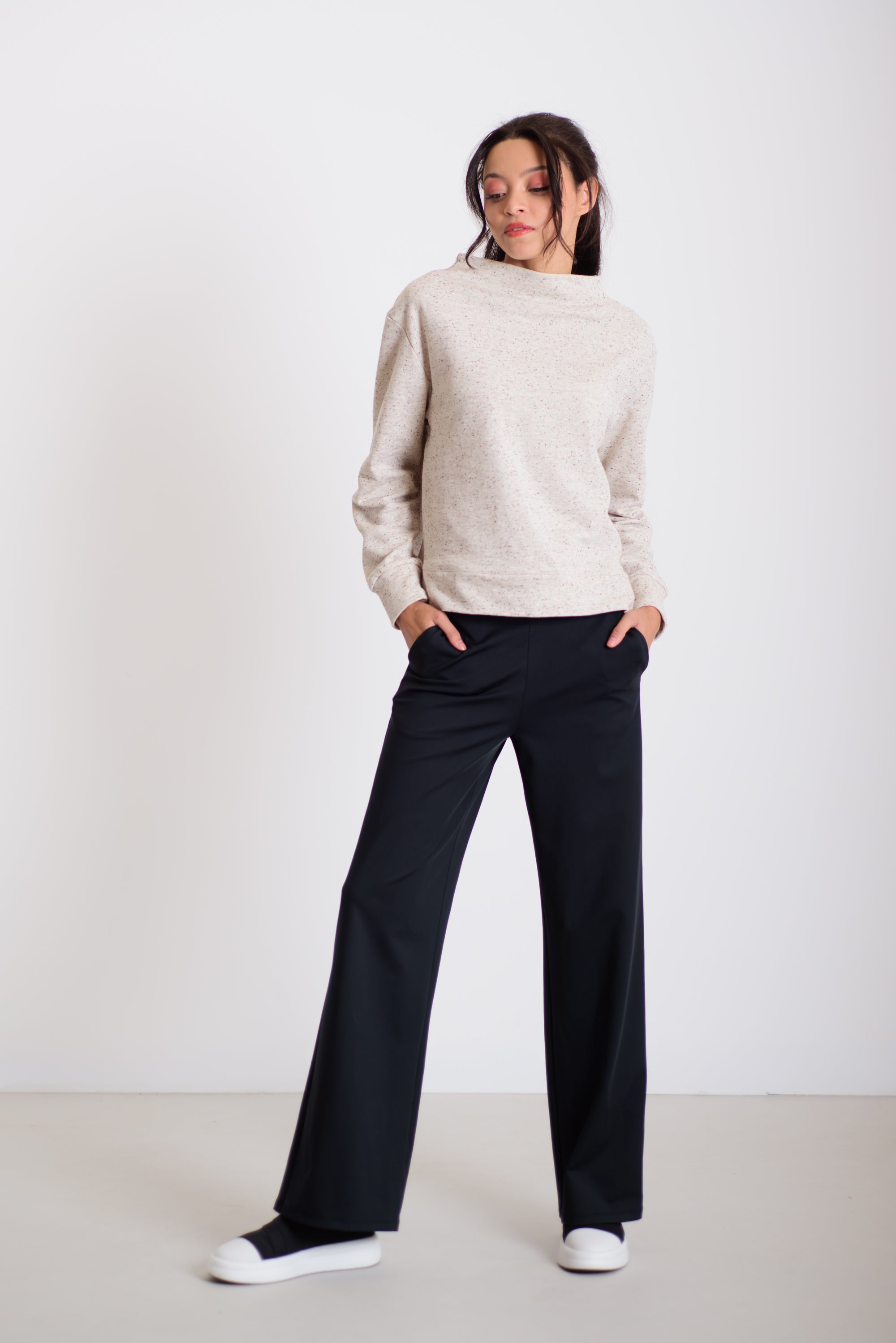 Ez a kellemes hosszúságú és lezserségű pulóver a különleges, varrás nélküli nyakmegoldásával és izgalmas anyagával azonnal kiemel az átlagosból. Könnyed esése miatt sokoldalúan kombinálható: aszimmetrikus derekú nadrágunkkal, a hajtott szoknyával, de akár egy egyszerű farmerrel is harmonikus, modern összeállítást ad. A pulóver kényelmes, mégis látványos darab a mindennapokra.