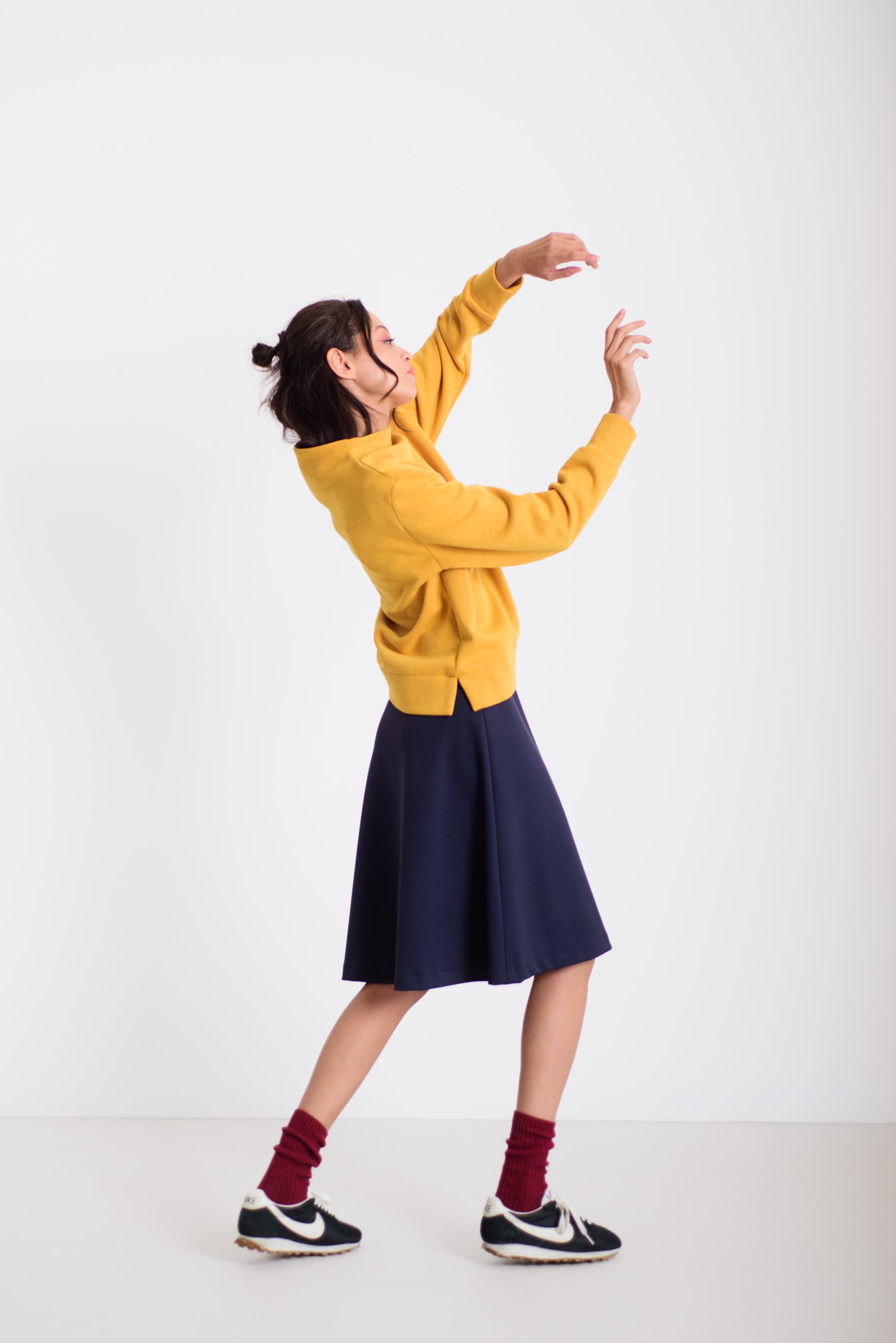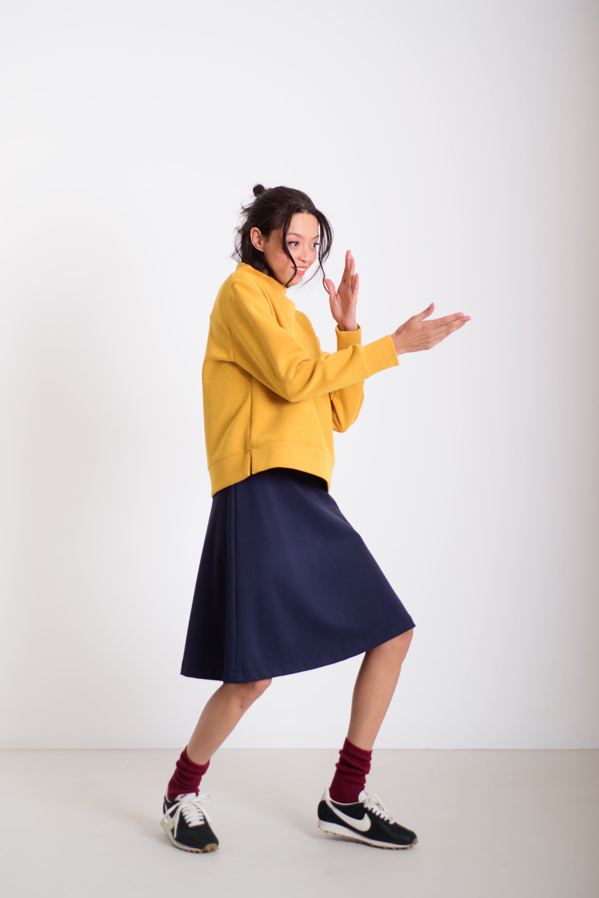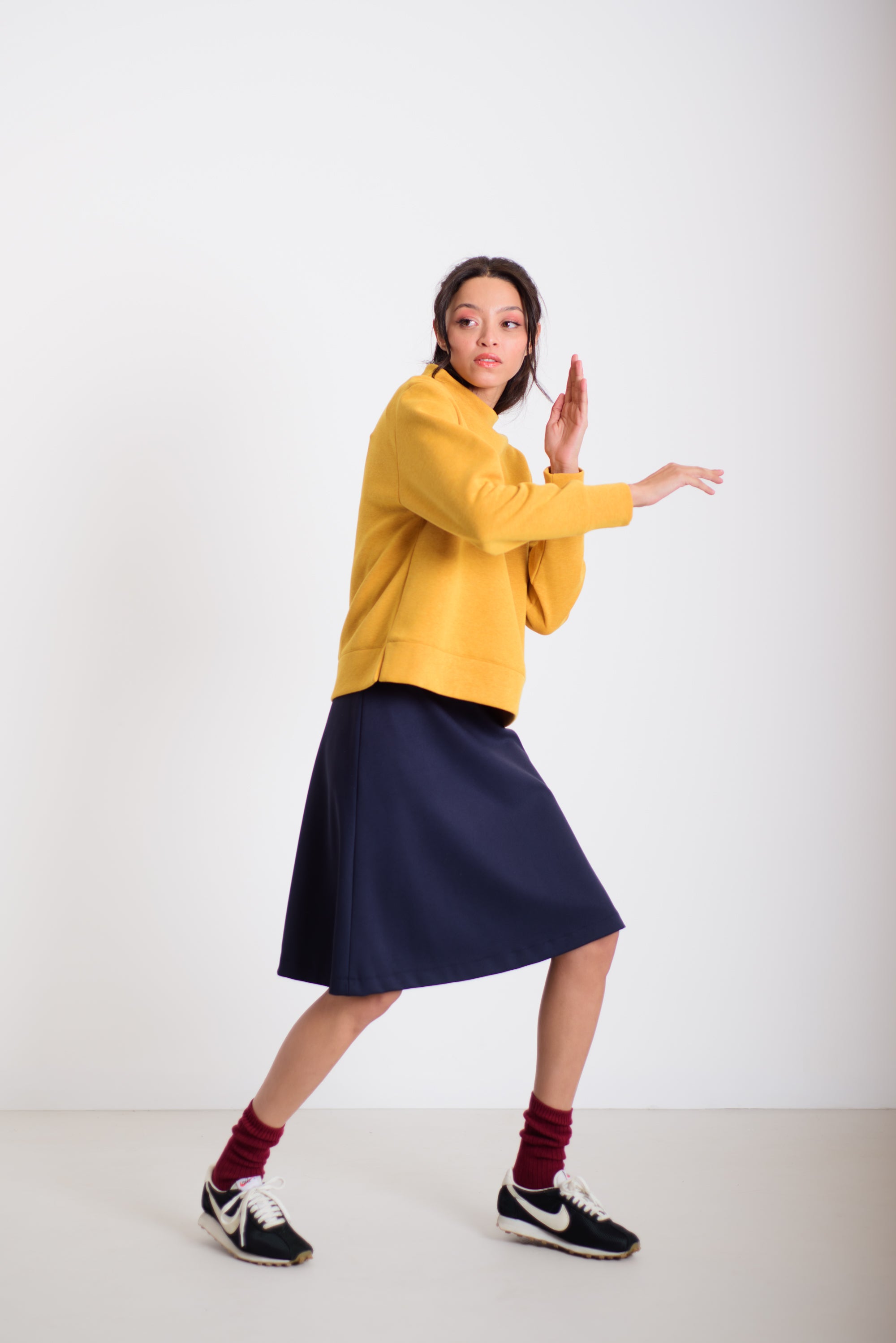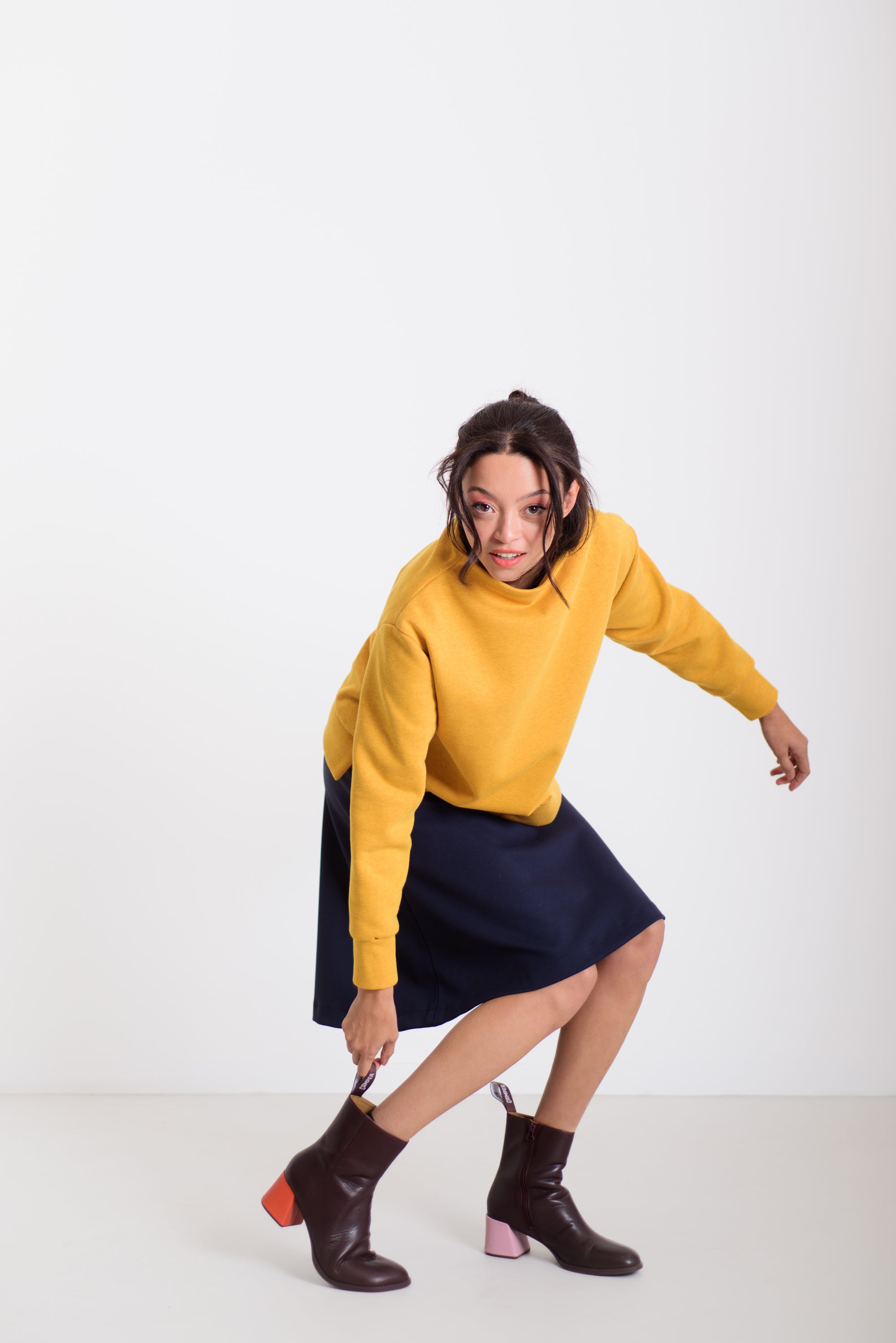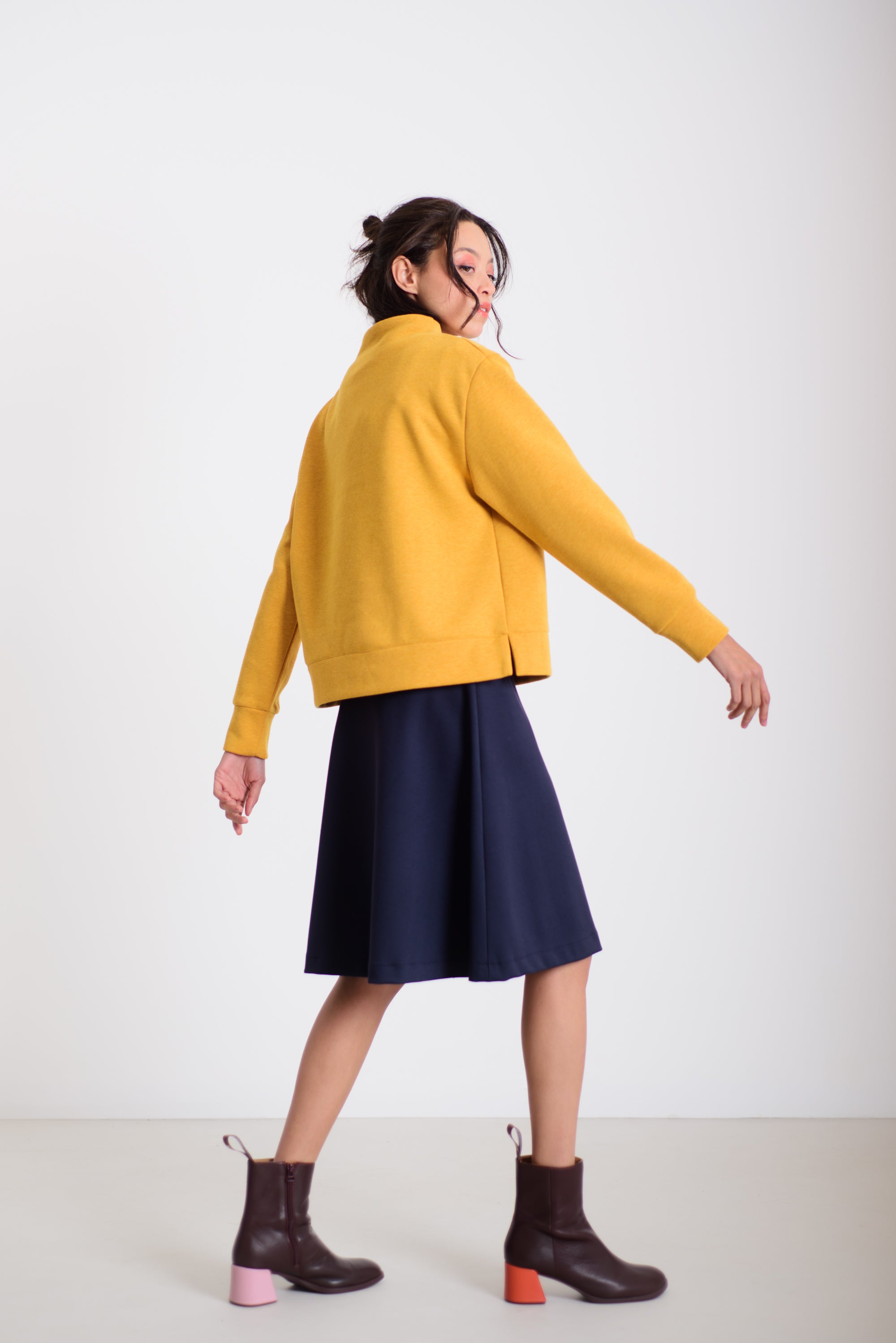 Ez a kellemes hosszúságú és lezserségű pulóver a különleges, varrás nélküli nyakmegoldásával és izgalmas anyagával azonnal kiemel az átlagosból. Könnyed esése miatt sokoldalúan kombinálható: aszimmetrikus derekú nadrágunkkal, a hajtott szoknyával, de akár egy egyszerű farmerrel is harmonikus, modern összeállítást ad. A pulóver kényelmes, mégis látványos darab a mindennapokra.