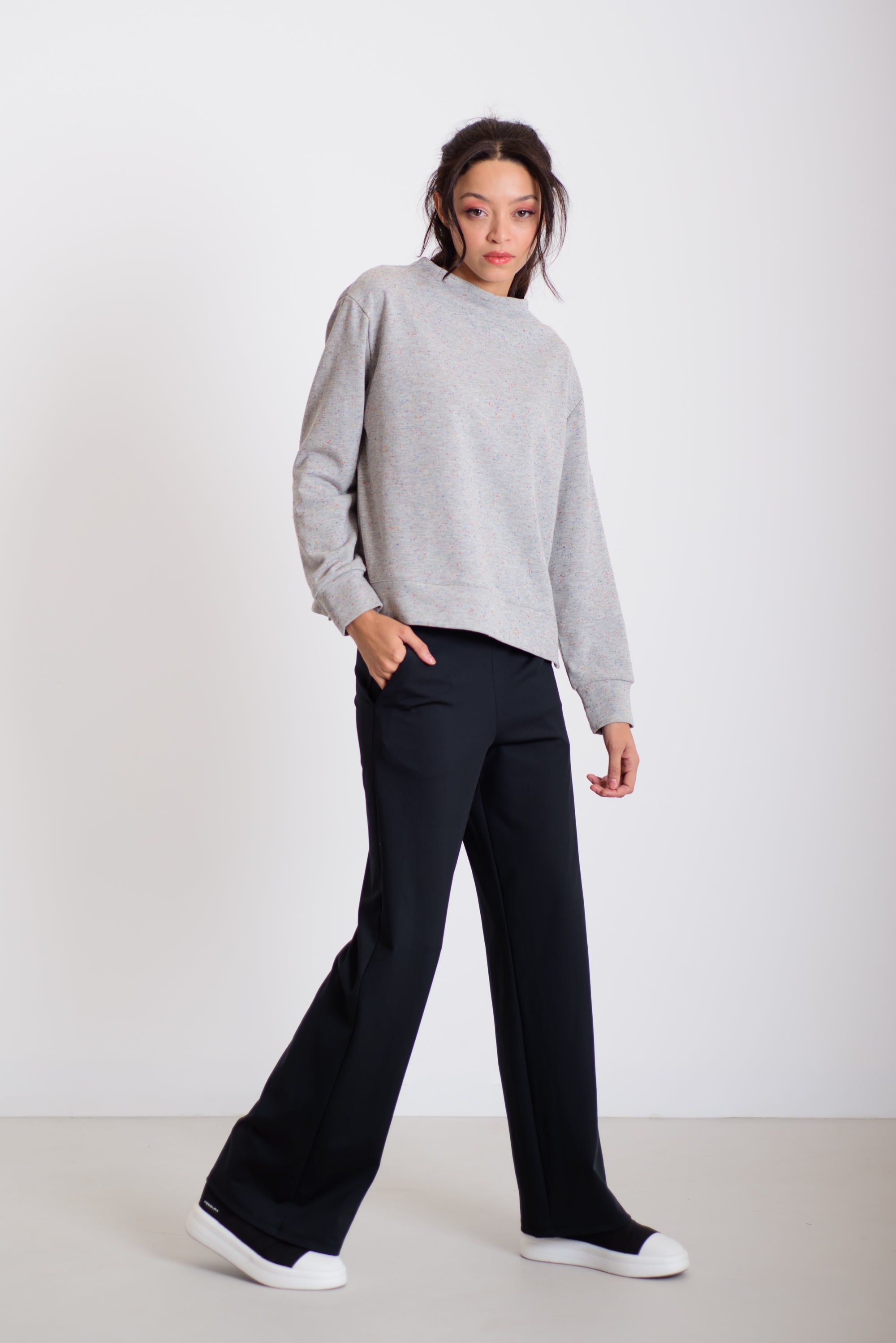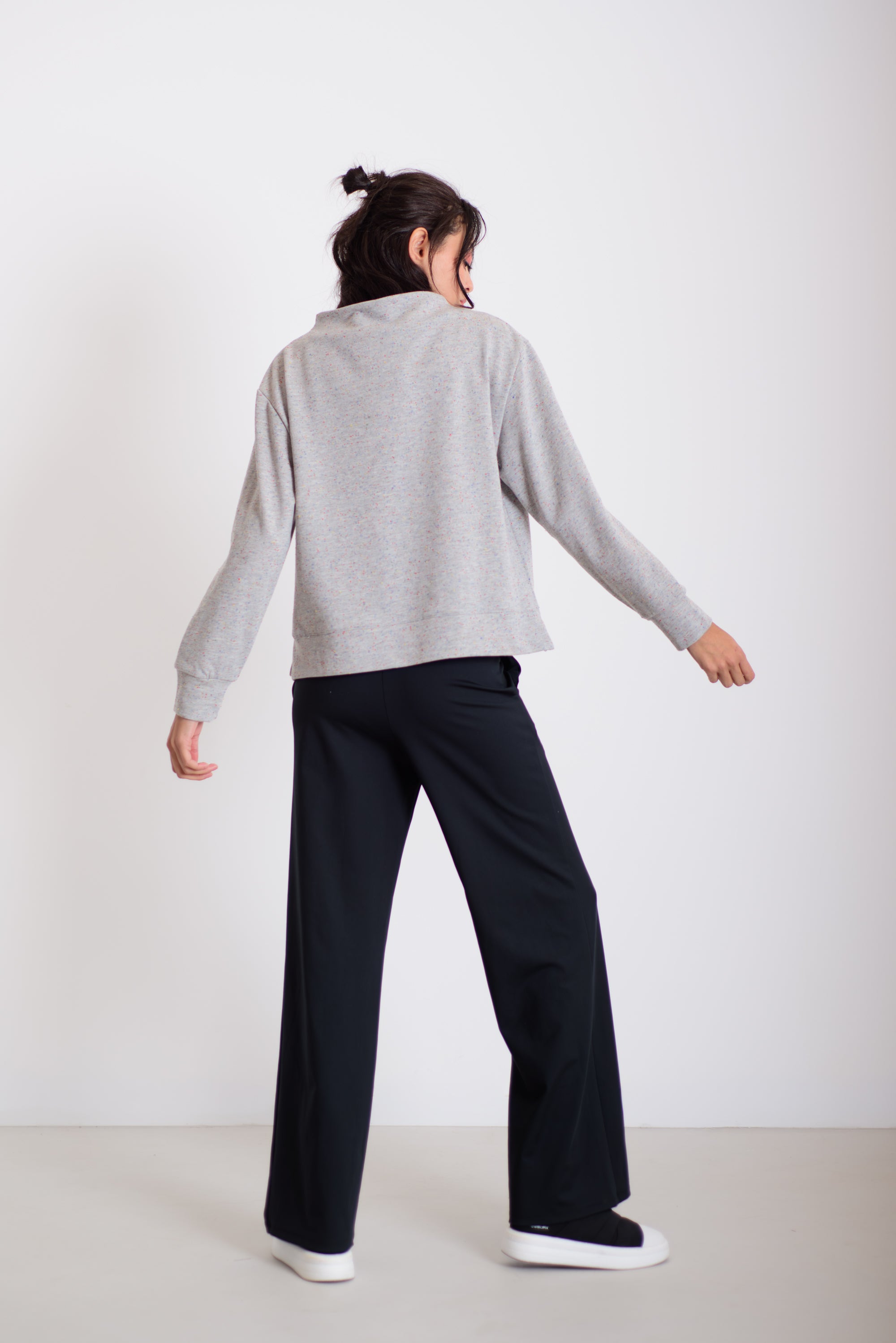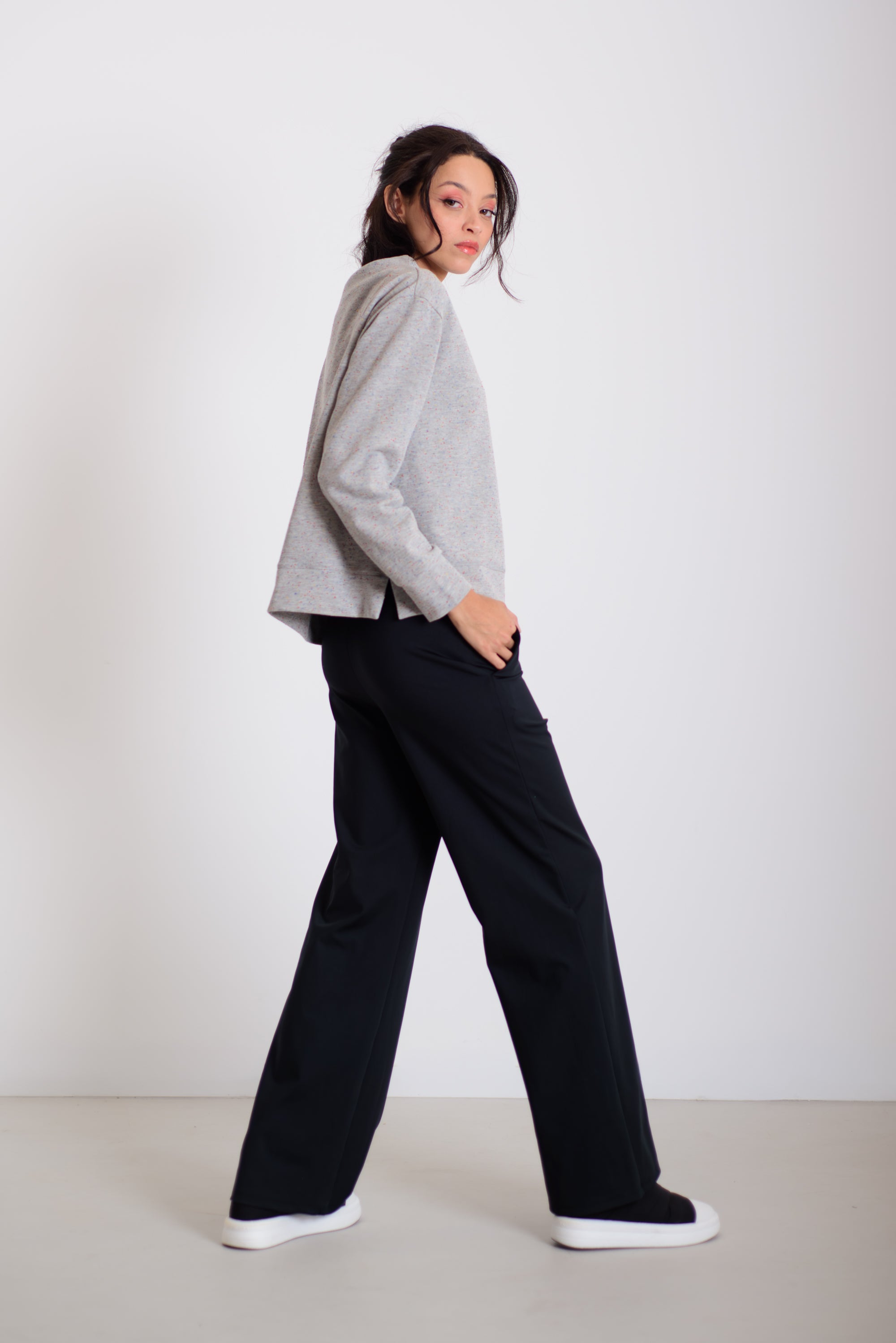 Ez a kellemes hosszúságú és lezserségű pulóver a különleges, varrás nélküli nyakmegoldásával és izgalmas anyagával azonnal kiemel az átlagosból. Könnyed esése miatt sokoldalúan kombinálható: aszimmetrikus derekú nadrágunkkal, a hajtott szoknyával, de akár egy egyszerű farmerrel is harmonikus, modern összeállítást ad. A pulóver kényelmes, mégis látványos darab a mindennapokra.